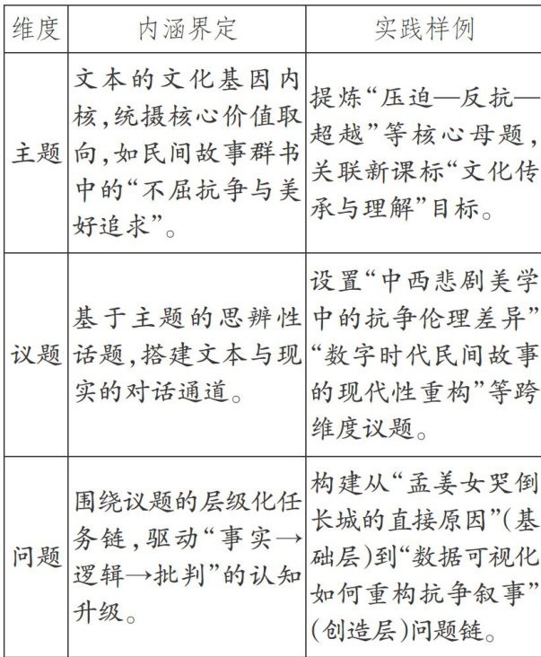 【摘要】针对小学整本书阅读教学中碎片化解读、思维培养低效等困境,基于认知发展理论与建构主义学习观,构建"主题锚定价值—议题拓展思辨—问题驱动探究”的三维协同机制,通过“文本语义网络分析—三维议题矩阵设计—三阶问题链建构—数字工具赋能”四步模型,助力学生开展民间故事群书阅读。