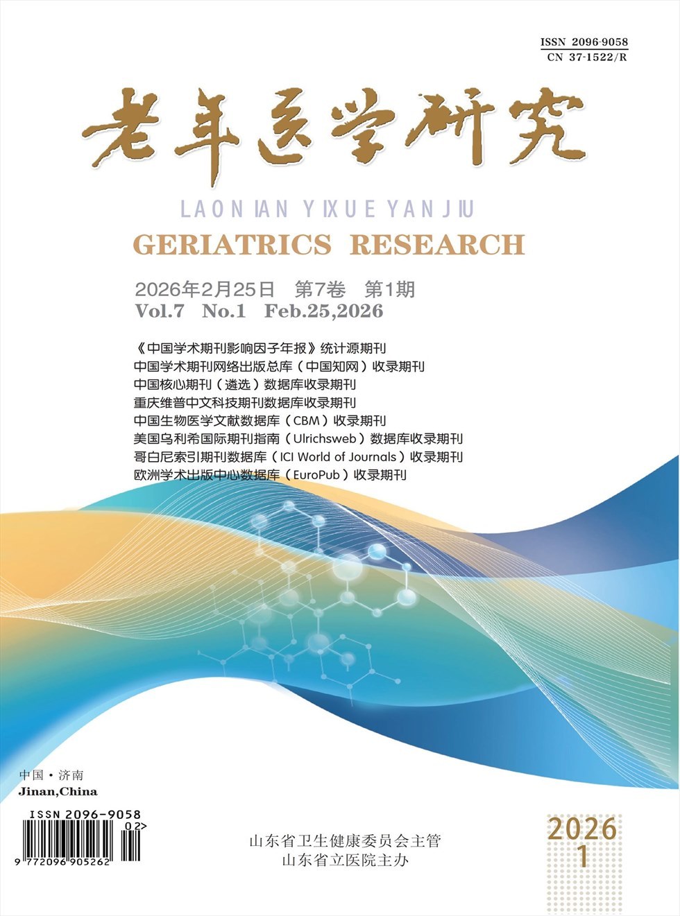 《老年医学研究》杂志是由山东省卫生健东第一医科大学附属省立医院主办的老年医学领域专业学术期刊,⒛20年10月创刊,双月刊。国内统一连续出版物号CN37-1522/R,标准国际连续出版物号ISSN2006-9058。本刊为老年医学研究领域的广大临床、科研工作者提供优质的学术交流平台,及时报道老年医学研究领域的科研成果,反映国内外老年医学研究的进展和动态。本刊主编为孙志坚。 本刊栏目有述评、临床研究、基础研究、病例研究、护理研究、综述、医养结合、医学伦理等。收稿要求为老年医学领域的相关研究,其中临床类研究需病例年龄≥60岁,基础类研究需以老年或老年疾病的细胞/动物模型为实验对象。