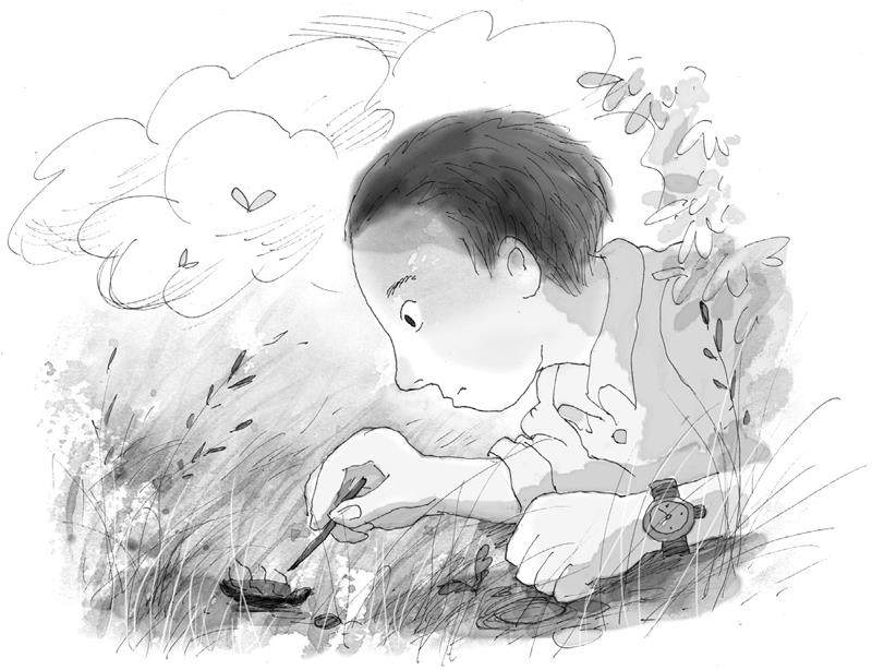 刚发现那只虫子时,我以为它在仰面朝天晒太阳呢。我正好走累了,坐在它旁边休息。其实我也想仰面朝天和它并排躺下来。我能体会到这只常年爬行、腹部晒不到太阳的小甲壳虫,此刻仰面朝天躺在地上的舒服劲儿。 这样想时突然发现这只甲壳虫朝天蹬腿的动作有些僵滞, 像在很痛苦地抽搐。我用一个小木棍拨了它一下,它正过身来,光滑的甲壳上反射着阳光,却很快又一歪身,仰面朝天躺在地上。 我想它是快要死了。不知什么东西
