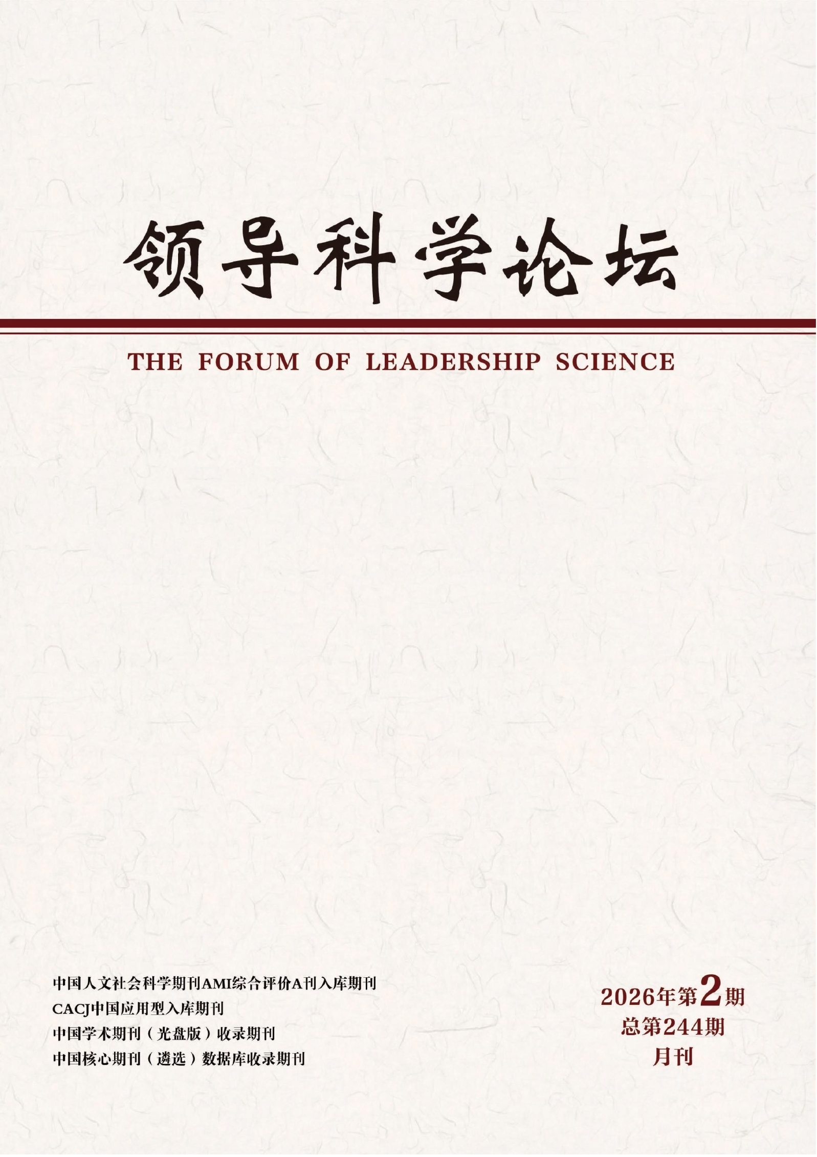 《领导科学论坛》杂志是反映我国教育界研究领导科学理论、实践科学领导最新成果的综合性期刊。中国高校领导科学第一刊,名列中国期刊方阵“双效”期刊、湖北省优秀期刊,由湖北教育报刊传媒有限公司、湖北省高等学校领导科学研究会主办。它坚持以马克思主义为指导,学习实践科学发展观,宣传领导科学理论,传递领导科学学术信息,推进领导科学学科建设,提供领导实践的经验教训,研究领导工作的文韬武略,探索领导人才的成败得失,提高干部领导科学发展能力,努力实现科学领导。既有前沿理论探讨,又使读者喜闻乐见。注重时代性、前瞻性、科学性、可读性和实践性,力求办出特色,办出水准。