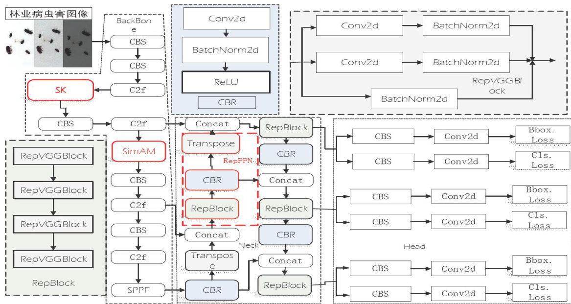 摘要:林业作为生态环境保护的关键产业,其发展时常受到病虫害的严重阻碍。在林业病虫害防治工作中,害虫的准确识别显得尤为重要。为了提升林业害虫识别的速度与准确性,提出一种基于改进YOLOV8模型的林业病虫害识别算法。首先,对Ai Studio平台上的林业病虫害数据集进行细致标注,并通过角度旋转、亮度调整及噪声添加等手段进行数据增强处理。其次,在原YOLOV8模型中创新性地融入了 SimAM模块、SK模块以及RepFPN特征融合结构,从而构建了这一改进的林业病虫害识别算法 SK-SimAM-RepFPN-YOLOV8。最后,通过在 Ai Stu-dio数据集上进行定量对比与定性评价,充分验证了所提方法的精确性和实用性。