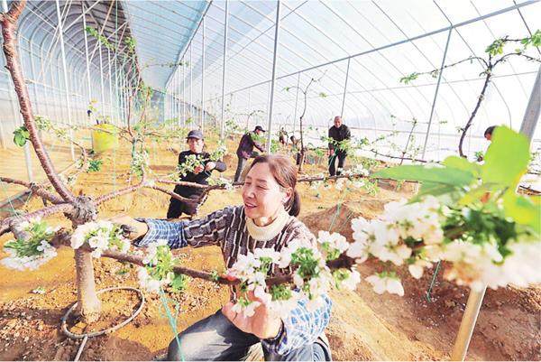 1月7日,临汾市浮山县天坛镇南霍村大棚樱桃种植基地,洁白如雪的樱桃花竞相绽放、清香扑鼻,村民正穿梭其间开展修枝、压枝、授粉等精细化管护作业,大棚内呈现出一派热闹景象。 闫锐鹏摄