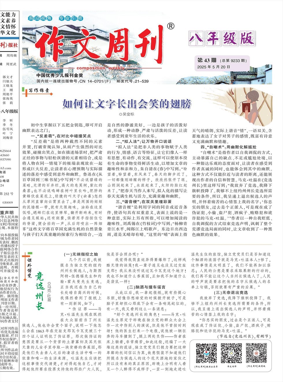 初中生掌握以下五把金钥匙,即可开启幽默表达之门: 一、“反差萌”:在对比中碰撞笑点 “反差萌”是将两种截然不同的元素并置,打破常规认知,从而产生强烈的对比效果,碰撞出笑点。如在描述场景时,把严肃正经的事物与轻松诙谐的元素相结合,或是将人物在同一情境下的极端表现放在一起形成巨大反差,让读者在心理预期与实际描述的落差中感受到意外和幽默。鲁迅在《从百草园到三味书屋》中写到“不必说碧绿的菜畦,光滑的石