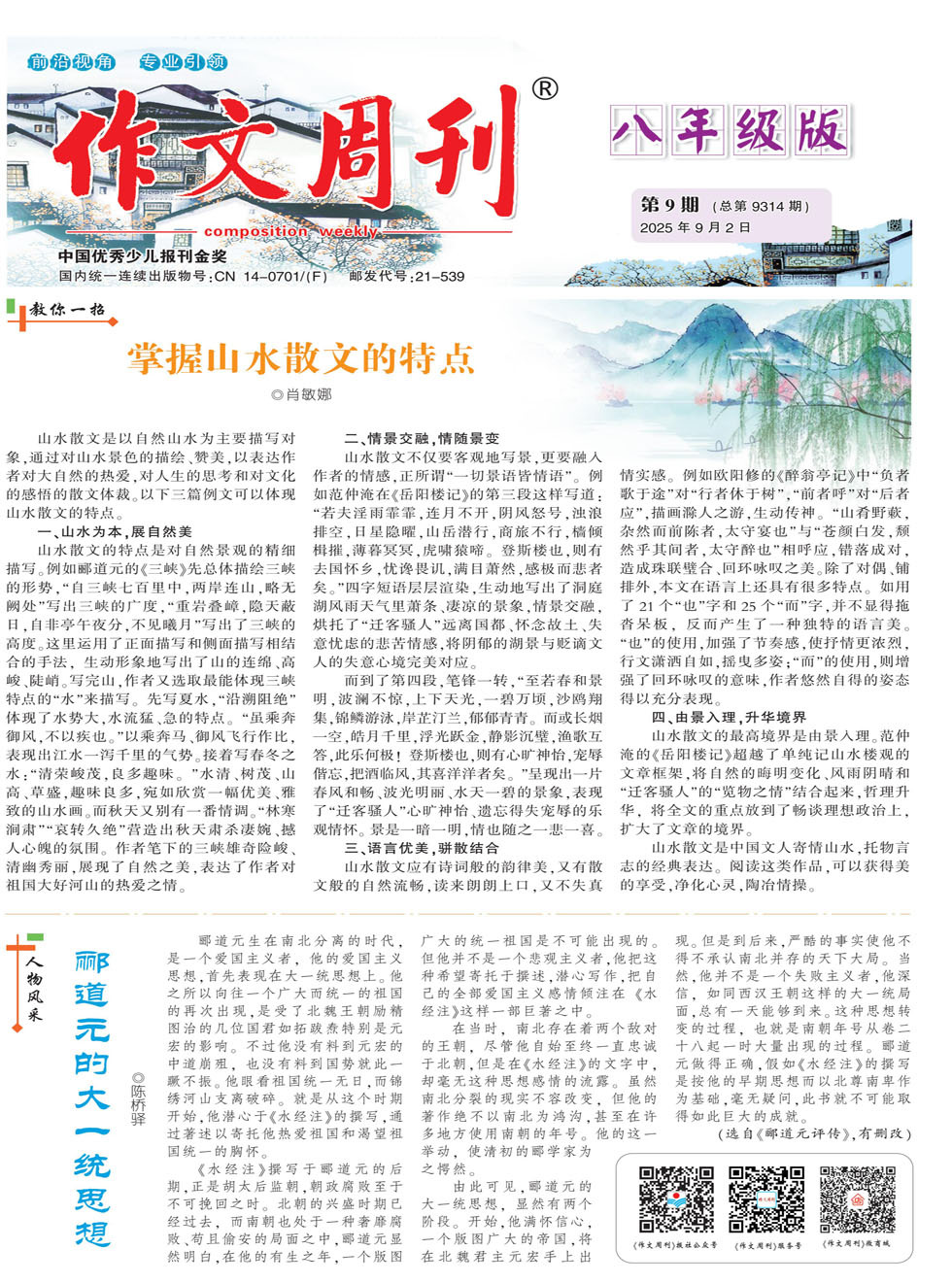山水散文是以自然山水为主要描写对象,通过对山水景色的描绘、赞美,以表达作者对大自然的热爱,对人生的思考和对文化的感悟的散文体裁。以下三篇例文可以体现山水散文的特点。 一、山水为本,展自然美 山水散文的特点是对自然景观的精细描写。例如郦道元的《三峡》先总体描绘三峡的形势,“自三峡七百里中,两岸连山,略无阙处”写出三峡的广度,“重岩叠嶂,隐天蔽日,自非亭午夜分,不见曦月”写出了三峡的高度。这里运用