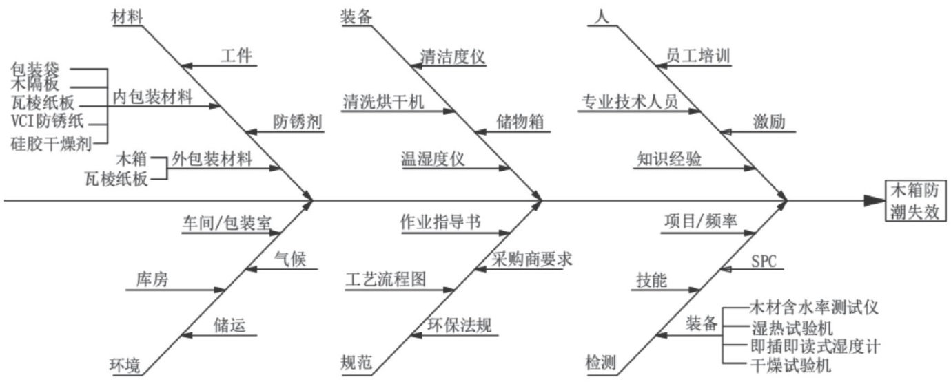 摘要:随着欧美对工业制成品及其包装环保标准要求的日益提高,原应用油基、含亚硝酸盐水基防锈的工艺已退出历史舞台,但应用欧美标准进口的或合资生产的水基防锈剂防锈,又面临高成本的技术难题。因而,国内大多数黑色金属零部件生产企业在探索应用水基切削液做产品的表面防锈,但在夏季使用低成本的水基切削液防锈、用木箱防潮包装的轴头在海运与海外仓储中特别易出现防锈失效的情况。为此,运用因素分析法,以鱼骨图方式,通过对轴头表面状态、包装环境、包装物技术指标、包装方式等分析研究,找出了影响木箱防潮包装的核心指标一水分含量的绝对值的多个因素。通过实验,对包装物和包装环境的水分绝对含量、工件的干燥度、包装方式、储存防护环境等方面进行了工艺指标参数化。经验证,需控制的内包装物适宜的含水率为:木隔板含水率 3%~6% 、瓦楞纸板 5%~8% 、硅胶干燥剂 ?4% 。在管理上,用气相防锈膜代替防锈纸;使用耐水性隔板间接削减包装袋的吸潮能力,有效阻隔了空气水汽渗透;包装环境控制操作空间的绝对湿度为 ?12g/m3 ,控制储运环境的负面影响因子。为固化成果对工作法进行了标准化,制定工艺流程与作业指导书,使SOP、SIP标准化管理,使系统影响因子控制获得了有效控制。