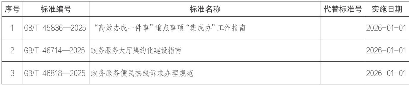 2025年第37号 关于批准发布《“高效办成一件事”重点事项“集成办”工作指南》等3项推荐性国家标准的公告 国家市场监督管理总局(国家标准化管理委员会)批准《“高效办成一件事”重点事项“集成办”工作指南》等3项推荐性国家标准,现予以公告。 国家市场监督管理总局国家标准化管理委员会 2025-12-27