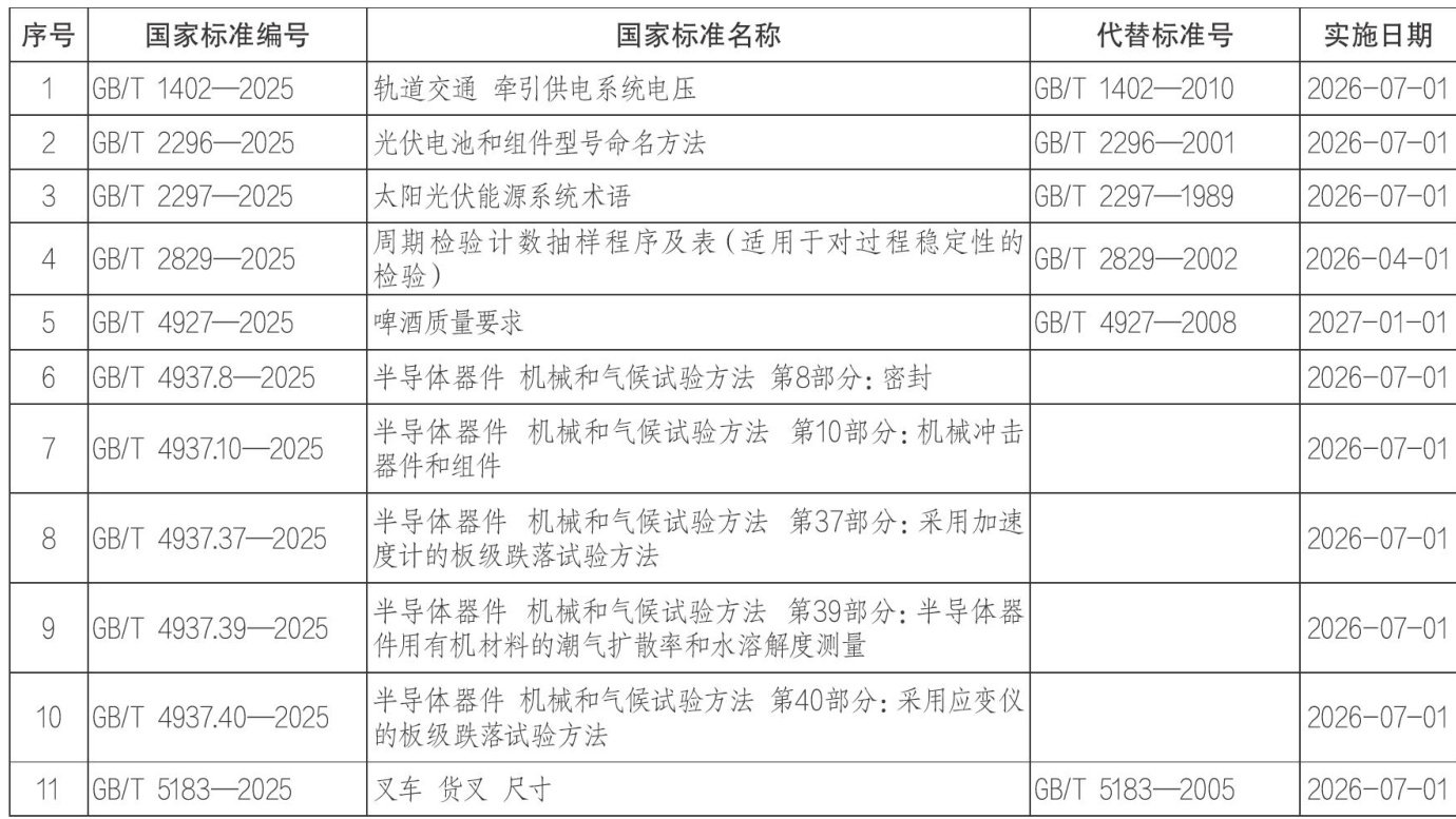 关于批准发布《轨道交通牵引供电系统电压》等360项推荐性国家标准和9项推荐性国家标准修改单的公告 批准《轨道交通牵引供电系统电压》等360项推荐性国家标准和9项推荐性国家标准修改单,现予以公告。 一、国家标准 国家市场监督管理总局国家标准化管理委员会2025-12-31 二、国家标准修改单