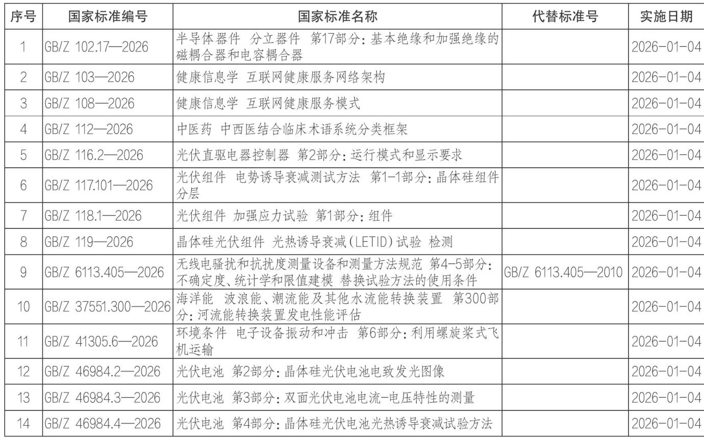 关于批准发布《光伏组件加强应力试验第1部分:组件》等14项国家标准化指导性技术文件的公告 国家市场监督管理总局(国家标准化管理委员会)批准《光伏组件加强应力试验第1部分:组件》等14项国家标准化指导性技术文件,现予以公告。 2026-01-04