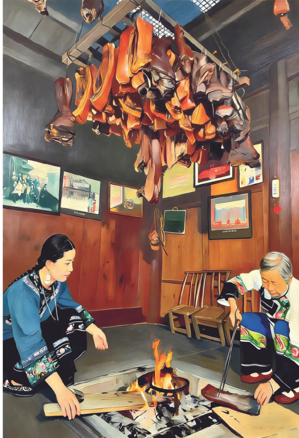 湘西腊肉,是老祖宗灵光一闪拽着光阴的衣袂留下的美食遗产,雄野如虎啸的沅水号子浸透了霜刀月斧斫碎的回味悠长的腊香。 冬至一过,年味开始顺着屋檐的冰溜子滴落下来,湘西的村村寨寨便乐陶陶地忙着杀年猪、炕腊肉。只有此时,农家兀兀穷年满怀期待的收成在梁上悬金中结成了火熏岁藏,鬓发如雪的阿婆阿母在满炕的烟霞金黄下露出了会心的微笑,终年在外波波碌碌的游子归来后在围炉添柴时找回了烙在心底的味道。一家煮肉满寨