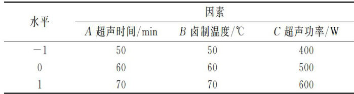 摘要:文章采用单因素试验探究了超声功率、超声时间、卤制温度对卤鸡翅的剪切力和感官评分的影响,单因素试验结果表明,当超声时间为 60min 、超声功率为500W、卤制温度为60℃时,嫩度最佳,感官评价较好。以感官评分为响应值,采用响应面法(三因素三水平)对超声辅助卤制工艺进行优化,回归模型的 P 值<0.001,R2>0.9 ,拟合性较好。通过验证试验,获得最佳超声辅助卤制工艺参数为超声时间 61min 超声功率530W. 卤制温度 60°C ,此条件下卤鸡翅的感官评分为31.03分。