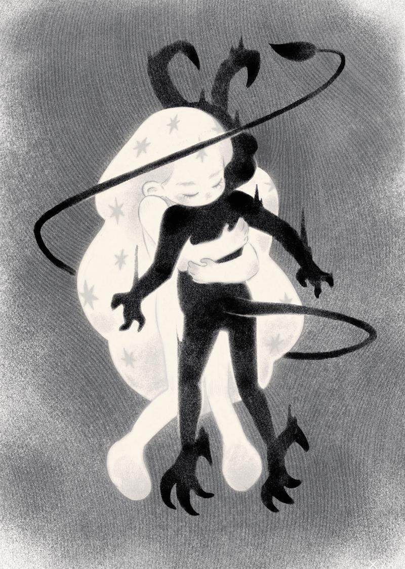 张小药原创作品《拥抱心里的怪物》。(来源:受访者供图) 在人生发生变故最多的一年,画师张小药创作了一幅名为《拥抱心里的怪物》的画。公司倒闭、失业、患上重病,种种遭遇让她创作了这幅陪她走过人生风雨的画。“拥抱心里的怪物”是张小药直面痛苦的一种“宣言”,因为她觉得“只有拥抱了心里的怪物,才能拥抱别人,才能爱人如己”。可令人讽刺的是,这幅从痛苦中生长出来的画却被一家拼图厂商经AI制图软件处理后,制成了