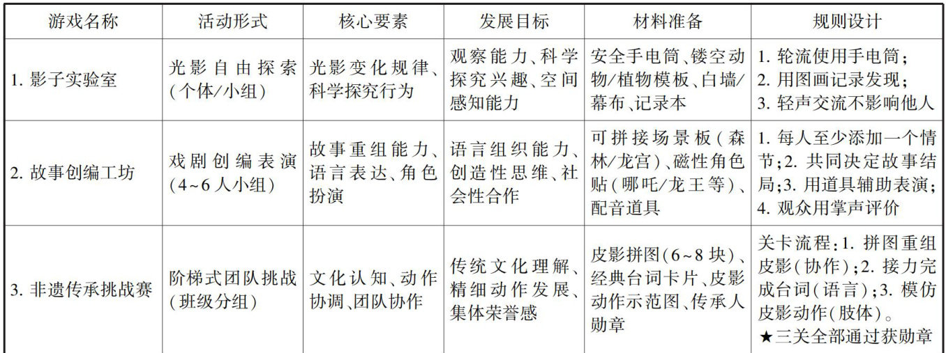 摘要:在新时代教育改革中推动华优秀传统文化融入教育体系的背景下,文章以“非遗皮影戏”为切入点,结合大班幼儿认知与发展需求,探索传统文化与幼儿游戏深度融合路径。研究指出,二者融合在文化传承、幼儿身心发展和认知建构等方面的价值,并提出元素转化、游戏设计、环境赋能、评价创新和家园共育五大策略,将皮影戏转化为幼儿可操作的游戏内容与互动环境,助力幼儿在趣味体验中传承文化、促进身心发展,为幼儿园传统文化教育提供理论与实践参考。