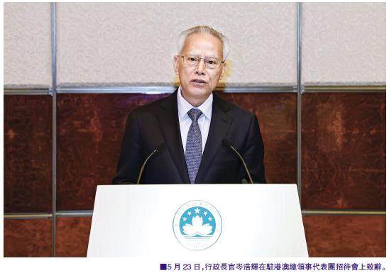 行政長官岑浩輝5月23日晚在外國駐港澳總領事代表團招待會上致辭時表示,澳門始終致力於搭建國際合作平台,並將進一步打造高水平對外開放平台和中西文明交流互鑑的重要窗口。澳門將主動對接國家發展戰略,以制度創新與政策優化為動力,以政府與市場、澳門與世界協同共進為基石,打造更加包容、更加便利、更加高效的國際交流舞台。 來自近50個國家和國際組織的駐港澳總領事及代表伉儷出席了招待會。代表團一行還參