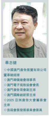 畢志健 ◇中國澳門廣告展覽有限公司董事總經理 ◇澳門歸僑總會理事長 ◇澳門電子商務協會會長 ◇澳門廣告商會副主席 ◇澳門國際創新節主席 ◇2025 亞洲廣告大會籌委會主席 ◇首屆會展發展委員會委員 全球旅遊業的競爭越來越激烈,澳門作為知名的旅遊城市,正在努力發展成國際級的旅遊休閒中心,希望吸引更多元化的遊客群體,尤其是消費力強的年輕族群。他們充滿活力又有消費能力,是澳門重點爭
