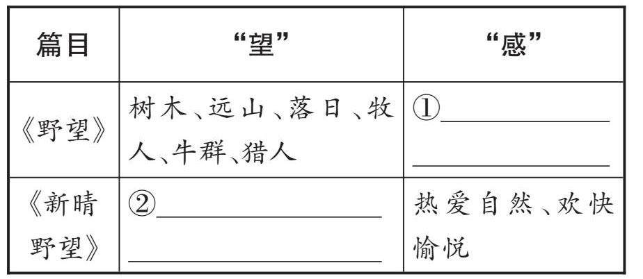 拓展阅读 (一)崇山峻岭,大江大河,展现自然之雄浑;田园风光,小桥流水,尽显乡村之恬淡。我们在领略自然之美的同时,也将感受到人生的广阔与深邃。阅读下面两首诗,回答后面的问题。 【甲】野 望 王 绩 东皋薄暮望,徙倚欲何依。 树树皆秋色,山山唯落晖。 牧人驱犊返,猎马带禽归。 相顾无相识,长歌怀采薇。 【乙】新晴①野望 王 维 新晴原野旷,极目②无氛垢③。 郭门临渡头,村树连溪