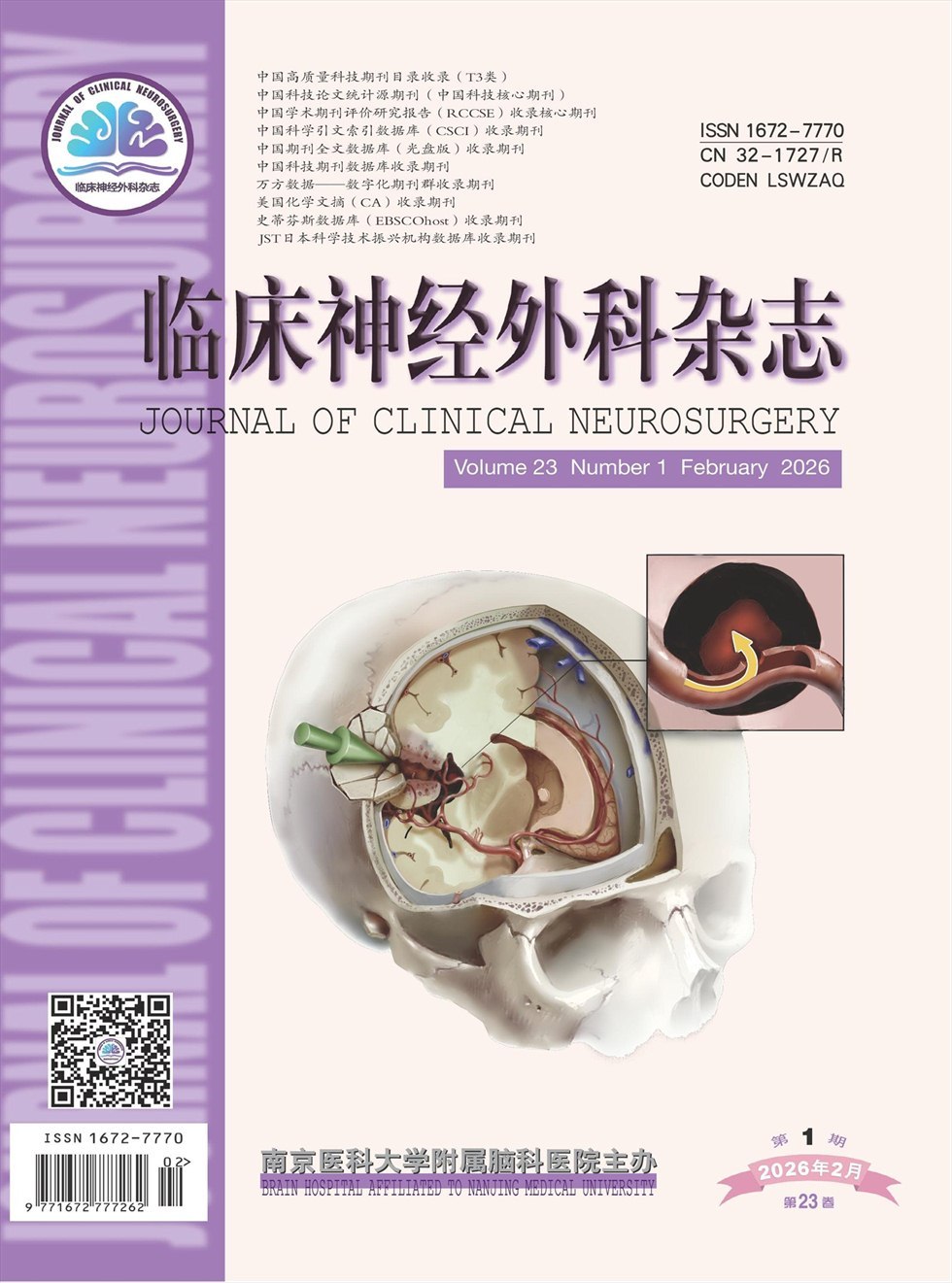 ??《临床神经外科杂志》2020年入选“中国高质量科技期刊”(神经病学领域T3级),连续入选“中国科技核心期刊”(中国科技论文统计源期刊)。杂志被评为第七届“华东地区优秀期刊”,先后荣获江苏省“十佳期刊传播奖”、江苏省期刊“明珠奖·优秀栏目”、华东地区期刊“优秀栏目”奖;获得国家OSID计划媒体融合专项基金。杂志被中国科学引文索引数据库(CSCI)、中国期刊全文数据库(光盘版)、中国科技期刊数据库、美国化学文摘(CA)、《史蒂芬斯数据库》(EBSCOhost)、JST日本科学技术振兴机构数据库(日)等收录。
