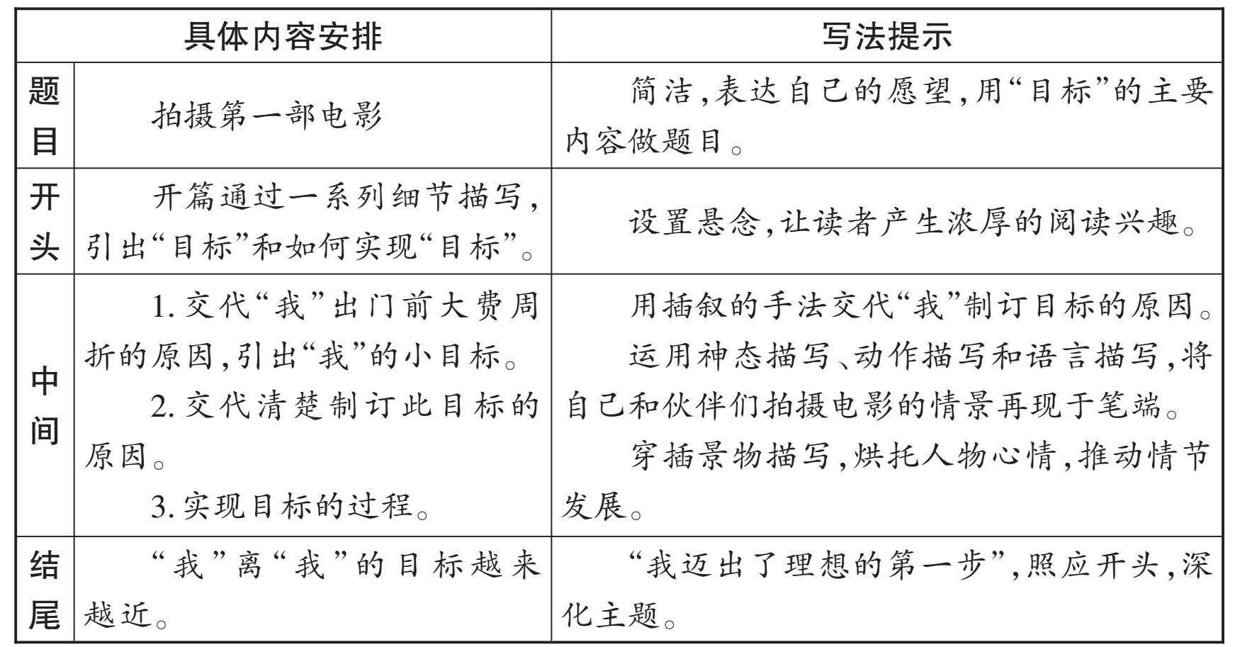第一步:列提纲,明确主干 第二步:填材料,贯通血脉 拍摄第一部电影 □ 周一毅 今天我要去实现我的目标——与朋友们拍摄自己人生中的第一部电影。 一直以来,拍一部电影就是我的目标。 走在街上,烈日所发出来的热量并未使我皱紧眉头,我依旧保持微笑。街边不时有穿着短袖、短裤的人发出“热死了,热死了”的叫喊,但穿着长袖衬衫及蓝牛仔长裤的我却感觉不到。尽管背上的汗水已使我的白衬衫透明得可以看见我的