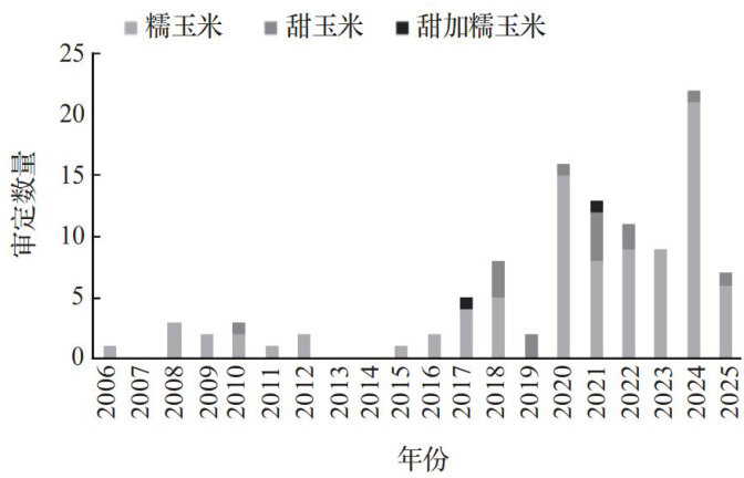 摘要:对2006-2025年通过黑龙江省审定的108个鲜食玉米品种的品种类型、选育机构、农艺性状及产量等进行统计和分析,总结了近年来黑龙江省审定鲜食玉米品种主要性状的变化特点,为黑龙江省鲜食玉米优良品种筛选、新品种选育和生产实践提供科学依据。结果表明,2006-2025年审定的鲜食玉米品种数量呈上升趋势,育种主体主要是科研院所和种子企业。从性状上看,甜玉米以黄色为主,糯玉米则以白色、黄色为主色调;鲜食玉米品种采收期70-95d;糯玉米生产试验产量与株高、穗位高、穗行数、百粒重呈极显著正相关,与穗粗呈显著正相关;甜玉米生产试验产量与株高呈显著正相关,与穗长、穗粗呈显著负相关。在性状选择时,应加大对这些性状的重视,同时应加强耐密品种的选择。