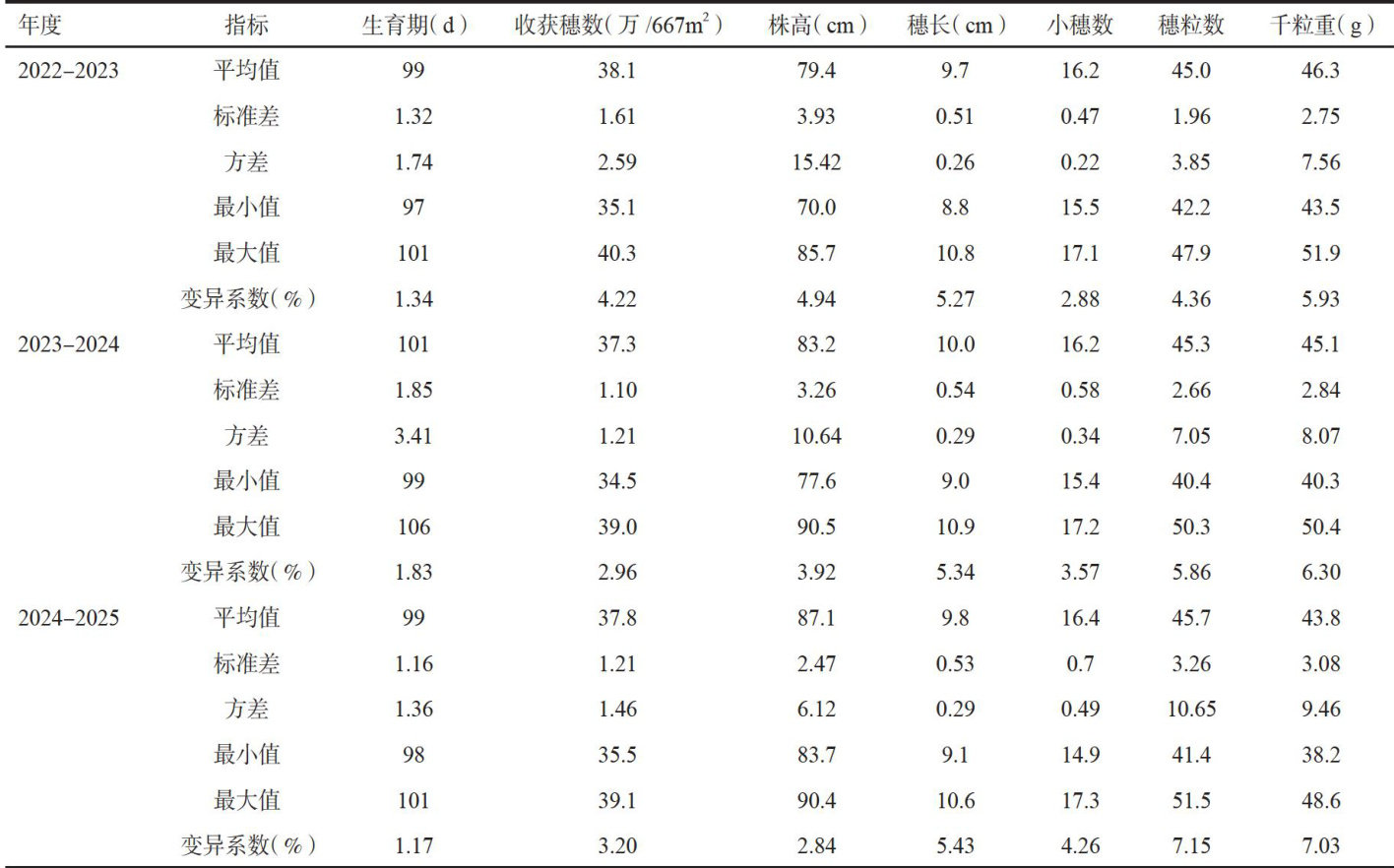 摘要:新疆是我国重要的粮食产区,小麦种植面积约占粮食作物总面积的 65% 。为进一步研究新育成小麦品种(系)的农艺性状特点及其与产量之间的关系,对2022-2025年度新疆优质小麦品种科企联合体区域试验和生产试验的小麦品种(系)的综合表现进行分析。结果显示:穗粒数、千粒重、穗长的变异系数相对较高,具有丰富的遗传变异;生育期、株高的变异系数较小,具有较高的遗传稳定性;抗病性分析发现多数品种兼具两种抗性,对叶锈病表现为高抗,白粉病表现为中抗及以上;垦春1799、粮春1931和兴木2004这3个品种的产量表现突出,与3个对照相比增产显著,增产幅度在 6.03%~18.47% 之间,具有较高的丰产潜力,同时具有稳产、适应性好等特性,可进一步扩大种植示范面积。