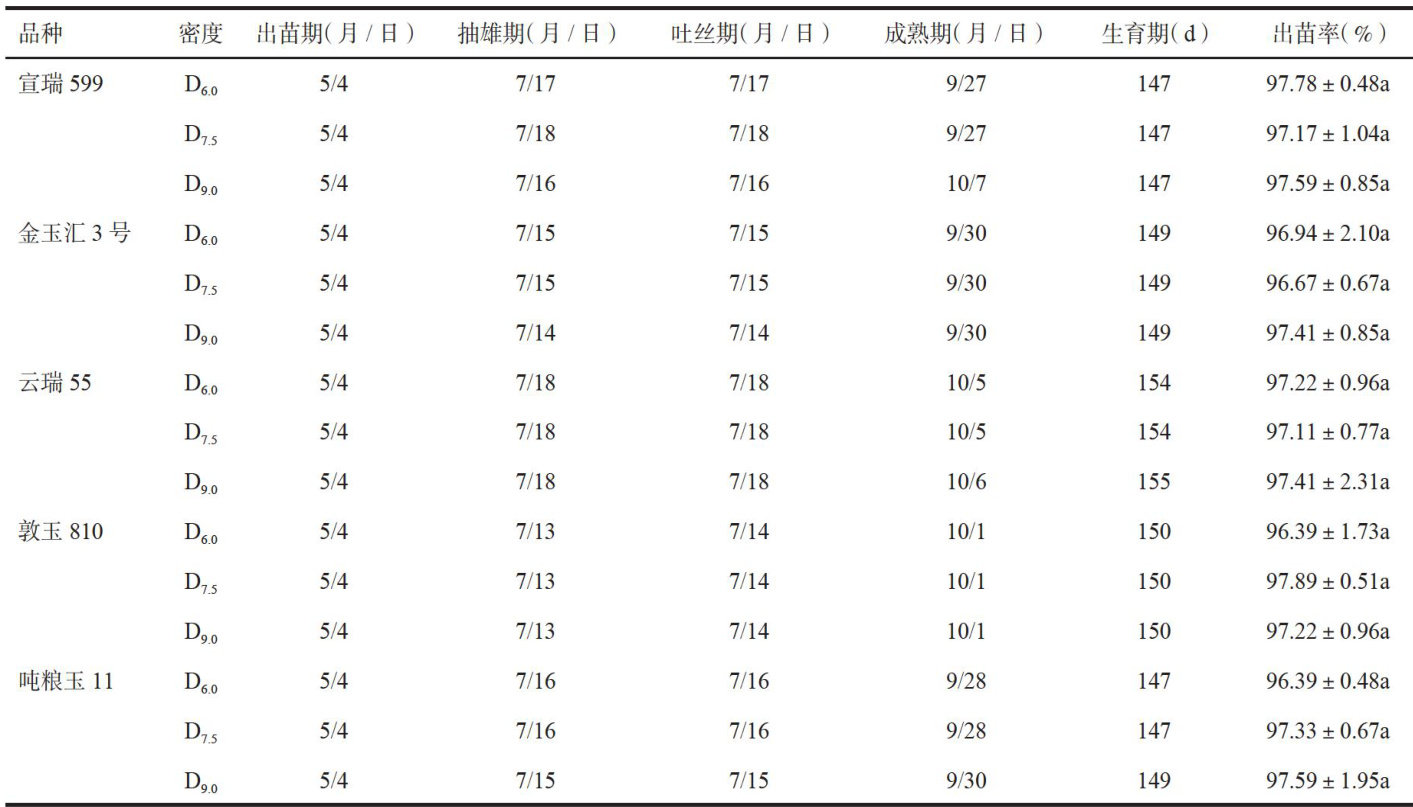 摘要:针对云南高原宣威市玉米生产面临的季节性缺水、种植密度不足及单产水平低等问题,以膜下滴灌技术为支撑,通过裂区试验系统研究不同种植密度(6.0万株 1hm2、7.5 万株 /hm2.9.0 万株 /hm2 )对5个玉米品种(宣瑞599、金玉汇3号、云瑞55、敦玉810、吨粮玉11)农艺性状及产量的影响。结果表明,密度增加对玉米生育进程无显著影响,但可显著调控植株性状和穗部性状;在倒伏倒折率、穗粗、穗长、秃尖长、产量等性状上,品种与密度间存在极显著互作效应。紧凑型品种宣瑞599和金玉汇3号表现出优良耐密性,在9.0万株 /hm2 高密度下产量分别达 17121.22kg/hm2 和 16484.98kg/hm2 ,较传统密度分别增产 27.02% 和 18.91% ,且空秆率低、穗部性状稳定;半紧凑型品种云瑞55和平展型品种敦玉810在高密度下减产达 8.89% 和 6.42% 倒伏倒折风险增加。回归分析进一步量化了品种耐密阈值,宣瑞599极限密度达9.92万株 /hm2 ,极限产量 17666kg/hm2 □研究结果为云南高原地区玉米密植栽培提供了品种筛选依据和技术路径,通过水肥一密度协同优化,可实现单产提升与资源高效利用,对区域粮食安全及产业转型升级具有重要的推广应用价值和实践参考意义。