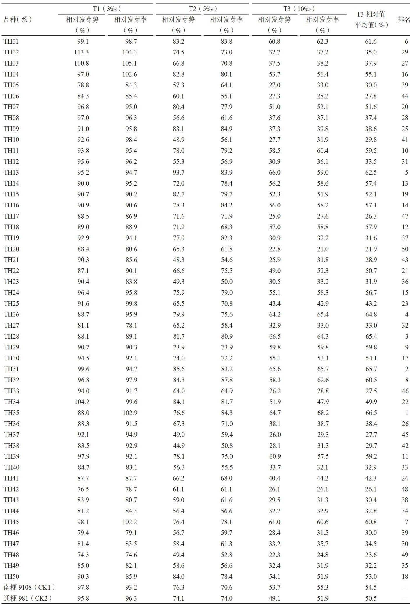 摘要:土壤盐渍化是制约水稻生产的主要非生物胁迫之一,培育耐盐且优质的水稻品种是盐碱地利用的关键。为了筛选出兼具强耐盐性和优良食味品质的品系,以50个自育水稻新品系和2个对照品种为试验材料,设置0(对照) ,3‰ 和 10‰ 的NaCI胁迫梯度进行发芽试验,测定发芽势和发芽率,并计算相对发芽率和相对发芽势以评价苗期耐盐性。利用质构仪和食味计测定稻米的硬度、黏度、平衡度、弹性、外观、口感和综合评分等食味品质性状。采用“耐盐性 + 品质”双维度交叉筛选方法,系统评价各品系的耐盐发芽特性(发芽势、发芽率及相对值)和食味品质特性(质地性状、感官评分、综合评分)。结果表明,盐胁迫下筛选出22个耐盐性强的品系,品质测定显示其中11个品系综合评分 ?70 分,满足优质食味标准,最终筛选出通海粳39号、通海粳45号、通海粳32号、通海鞭31号、通海粳26号、通海粳14号、通海粳30号、通海粳22号、通海粳24号、通海粳04号、通海粳50号,共11个耐盐优质协同品系,在重度盐胁迫下T3综合相对值 50.7%.65.7% ,品质综合评分71.6\~80.4分,且硬度、黏度、平衡度等核心指标协调。本研究建立了一套将生理耐盐性与稻米品质相结合的综合筛选体系,成功筛选出多个耐盐优质水稻新品系,为南通滨海盐碱地水稻优质丰产种植提供了适宜品系,为耐盐水稻育种及滩涂盐碱地的开发利用提供了重要的材料基础和理论依据。