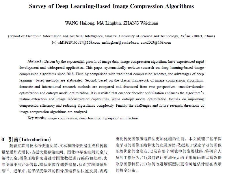 摘 要:由于图像数据的爆炸式增长,使得图像压缩算法得到蓬勃发展与广泛应用。系统综述了自2018年以来基于深度学习的图像压缩算法研究工作;首先,对比传统算法,阐述了深度学习算法的优势;其次,基于图像压缩算法经典框架,从编解码器优化和熵模型优化两方面对国内外研究方法进行对比和讨论。研究发现,编解码器能优化提升算法的特征提取与图像重建能力,熵模型优化则致力于提升压缩效率和降低算法复杂度。最后,分析了图像