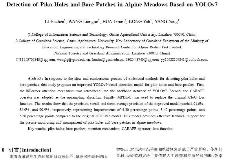 摘 要:针对传统的鼠洞、秃斑检测方法速度慢、过程烦琐等问题,提出了一种基于改进YOLOv7的鼠洞、秃斑检测模型。首先,在YOLOv7的主干网络中引入BiFormer注意力机制;其次,引入CARAFE算子作为上采样算法;最后,将MPDIoU代替原模型的CIoU损失函数。实验结果表明,改进模型的准确率、召回率、平均精度均值分别达到了91.6%、86.0%和90.9%,较原YOLOv7模型分别提升了4.