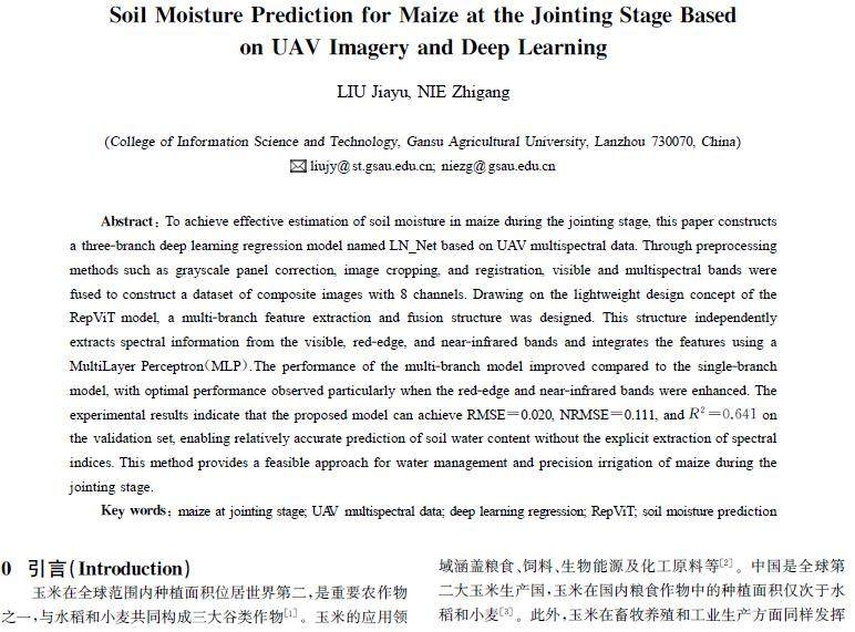 摘 要:为实现拔节期玉米土壤水分的有效估测,基于无人机(UAV)多光谱数据构建了三分支深度学习回归模型LN_Net。通过灰度板校正、图像裁剪与配准等预处理手段,对可见光与多光谱波段进行融合,构建了具有8个通道的复合图像数据集。并借鉴RepViT模型轻量化的思路,设计了多分支特征提取与融合结构,在可见光和红边、近红外波段独立提取光谱信息,并通过多层感知机(MLP)进行特征整合。多分支结构模型性能较单