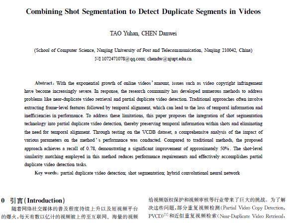 摘 要:随着网络视频数量呈指数级增长,视频版权等问题愈发严重。相关的科研领域也诞生了许多方法用于解决近似重复视频检索和部分重复视频检测等问题。以往的方法通常是先提取帧级特征再进行时间对齐,这会导致时序信息的丢失以及性能浪费。为此提出将镜头分割技术引入部分重复视频检测方法,保留镜头内的时序信息,并省去了时间对齐步骤。通过在VCDB数据集上的测试,全面地分析了各项参数对方法性能的影响。与传统方法对比,