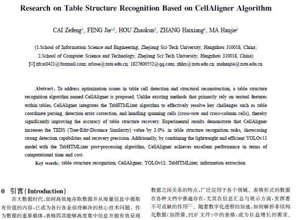 摘 要:针对表格单元格检测与结构重建中的优化问题,提出了一种名为CellAligner的表格结构识别算法。与现有方法主要依赖表格内文本特征不同,CellAligner通过集成TabHTMLizer算法,有效解决了表格坐标解析、检测误差修正、跨行跨列单元格处理等关键问题,从而显著提升了表格结构恢复的精度。实验结果表明,CellAligner在表格结构识别任务中提升了树编辑距离相似度(TEDS)值达3
