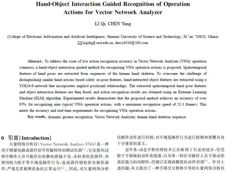 摘 要:针对矢量网络分析仪(VNA)操作场景中动作识别率低的问题,提出一种手部交互物体引导的矢量网络分析仪操作动作识别方法。利用人体手部骨架序列提取手部姿态时空特征,针对手部相似动作难以通过姿态特征区分的问题,凭借隐含位置关系的YOLOv8网络提取手部交互物体特征,对得到的手部姿态时空特征和交互物体特征进行融合,使用极限学习机(ELM)算法得到动作识别结果。实验结果表明,所提方法对9种典型矢量网络