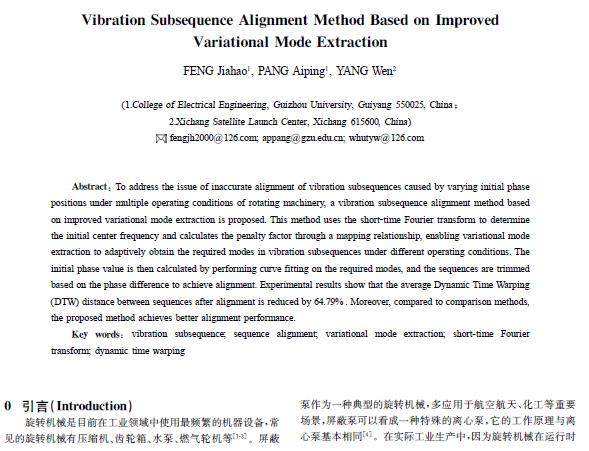 摘 要:针对旋转机械多工况下,振动子序列起始点位置(初相位)不同导致序列无法准确对齐的问题,提出了一种基于改进变分模态提取的振动子序列对齐方法。使用短时傅里叶变换确定初始中心频率,通过映射关系计算惩罚因子,使得变分模态提取可以自适应地获取不同工况下振动子序列中的所需模态。对所需模态进行曲线拟合计算出初相位值,并根据相位差对序列进行裁剪,实现序列对齐。实验结果表明,该方法对齐后序列之间的动态时间扭曲