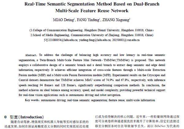 摘 要:针对实时语义分割中高精度与低延迟难以兼顾的问题,提出双分支多尺度特征复用网络(TMMNet)。该网络采用语义分支与细节分支协同设计,分别提取深层语义与边缘细节信息,并通过多尺度信息提取融合模块(MEF)与多尺度信息融合还原模块(MFR)实现跨尺度特征的高效整合。在Cityscapes和Camvid数据集上的实验结果表明,TMMNet的MIoU分别为74.9%和67.8%,同时推理速度高达9