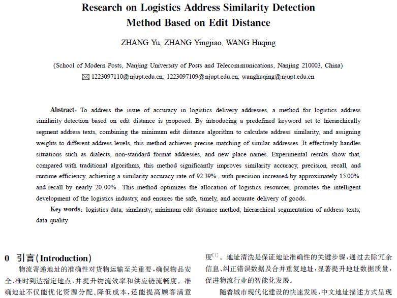 摘 要:为解决物流寄递地址准确性问题,提出了一种基于编辑距离的物流地址相似度检测方法。通过引入预定义关键词集合对地址文本进行层级分割,结合最小编辑距离算法计算地址相似度,并为不同地址层级分配权重,实现了对相近地址的精准匹配,有效处理了方言、非标准格式地址及新地名等情况。实验结果表明,与传统算法相比,该方法在相似度准确率、查准率、召回率及运行耗时方面均显著提升,相似度准确率达92.39%,查准率提升