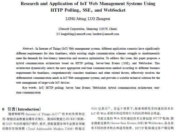 摘 要:物联网(IoT)Web管理系统中,不同应用场景对数据的时效性要求存在显著差异,而现有单一通信方案难以同时满足低延迟交互和资源优化的需求。针对这一问题,提出了一种基于HTTP轮询、服务器推送事件(SSE)和WebSocket的混合通信架构。该架构根据业务对时效性的不同要求,动态选择最适合的实时通信方式,综合考虑时效等关联因素,有效解决了IoTWeb管理系统中的差异化通信需求,为大规模IoT设