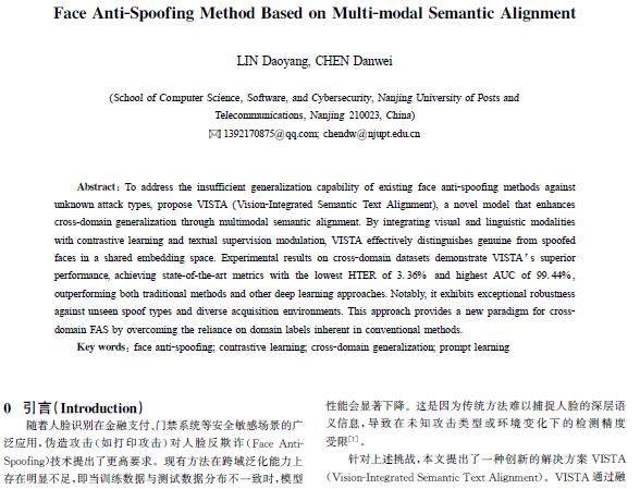 摘 要:针对现有人脸反欺诈方法在面对未知欺诈类型时泛化能力不足的问题,提出VISTA(Vision-IntegratedSemanticTextAlignment)模型。通过多模态语义对齐,融合视觉和语言模态,采用对比学习和文本监督调制,在共享嵌入空间区分真伪人脸。跨域数据集上的实验结果显示VISTA的半总错误率HTER最低降至3.36%,曲线下面积AUC最高达99.44%,优于传统方法和其他深度