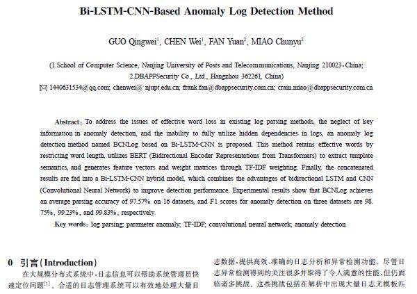 摘 要:为解决现有日志解析方法中有效词丢失和异常检测忽略关键信息以及无法充分利用日志中隐藏的依赖关系问题,提出了一种基于Bi-LSTM-CNN的异常日志检测方法BCNLog。该方法通过分词长度限制保留有效词,利用双向编码器表示来自变压器(BERT)(BidirectionalEncoderRepresentationsfromTransformers)提取模板语义,并通过词频-逆文档频率(TF-I