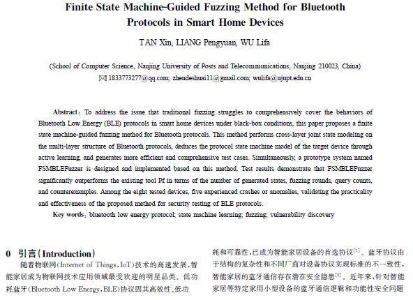 摘 要:针对传统模糊测试难以全面覆盖黑盒条件下的智能家居低功耗蓝牙(BLE)协议行为的问题,提出了一种基于有限状态机引导的蓝牙协议模糊测试方法。该方法对蓝牙协议的多层结构进行跨层联合状态建模,通过主动学习推导目标设备的协议状态机模型,生成更高效、更全面的测试用例。同时,基于此方法设计实现原型系统FSMBLEFuzzer。测试结果表明,FSMBLEFuzzer在生成的状态数、模糊测试轮数、查询次数、
