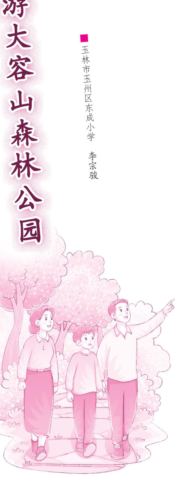 我和家人兴致勃勃地来到大容山森林公园游玩。这里风景如画,有“南方西岳”的美誉。 汽车沿着蜿蜒的盘山公路向上行驶,窗外的风景随着海拔的升高不断变换着。云雾中,一座座风力发电机错落有致地点缀在群山中,为群山增添了几分灵动。正当我沉醉在这样的美景中时,汽车悄然驶入了大容山深处。 忽然,小莲池映入了我的眼帘。静谧的湖面宛如一块镶嵌在群山之间的美玉,“潭面无风镜未磨”形容的就是这样的美景吧。湖水清澈见底