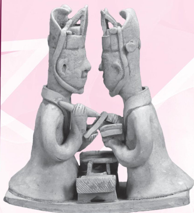 青瓷对书俑 材质:陶瓷器 年代:西晋 来源:1958年长沙市金盆岭9号墓出土 尺寸:高17.2厘米,板长15.5厘米,宽7.8厘米 收藏单位:湖南省博物馆 两个头戴进贤冠、身着长袍的青瓷俑相对忌坐,其中一个人俑拿着笔和竹简,正在书写着什么,另一个人俑手上拿着板子,上面放着简册,嘴里似在念念有词,看起来非常认真、敬业。两个人俑中间放着一张书案,上面有一个长方形的砚台、四叉的笔架,架上