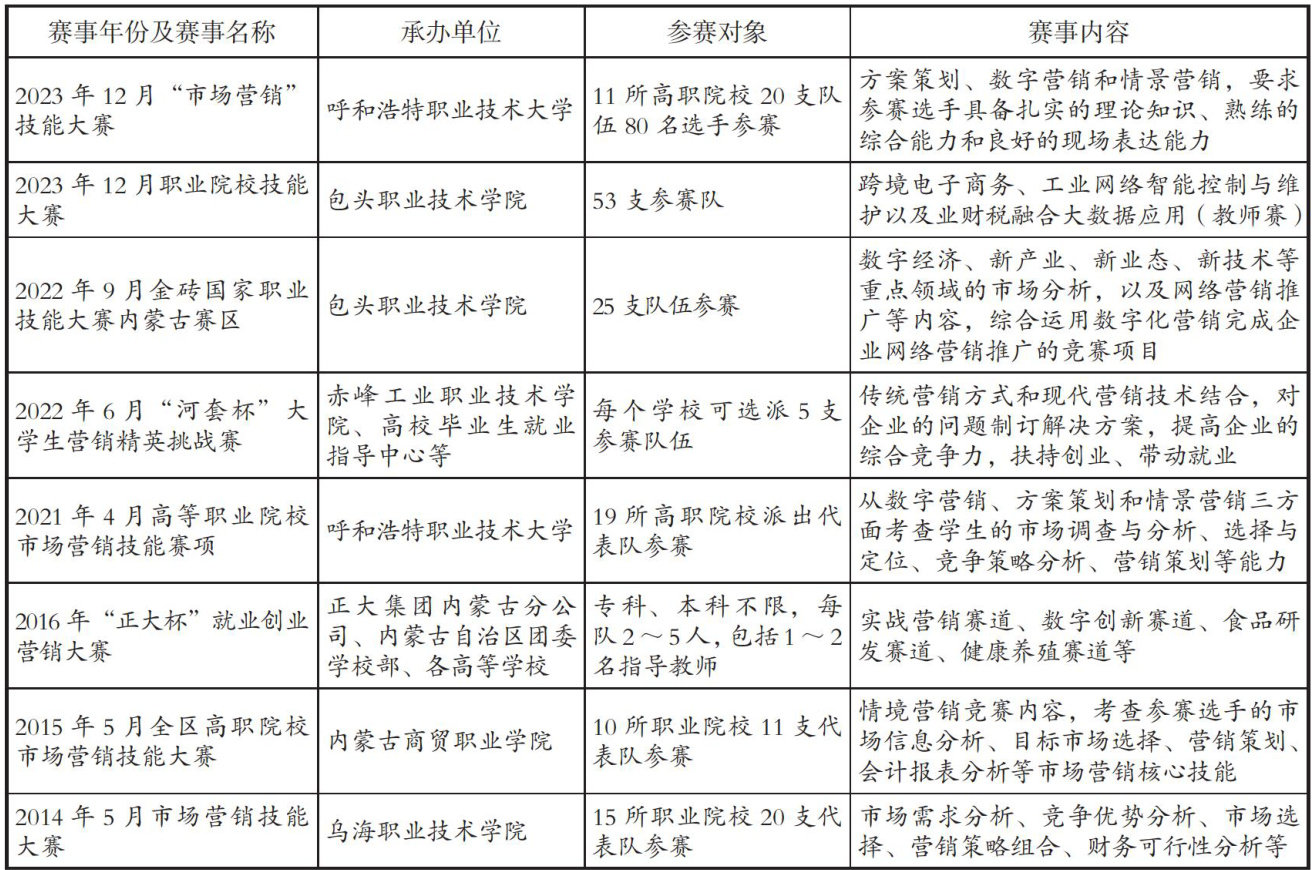 [摘要]社会对职业院校市场营销专业学生的要求在当前经济快速发展的形势下也在水涨船高。针对职业院校学生的特点,如何培养实践能力强、能够快速融入社会的毕业生是亟待解决的问题,学科竞赛实为行之有效的方法。立足内蒙古农业大学职业技术学院市场营销专业,从学科竞赛的类型和意义、当前影响学科竞赛的主要问题及发展对策出发,针对以赛促教、以赛促建、以赛促学、促进职业院校学生综合素养提升,促进营销专业人才队伍建设等内容展开论述。
