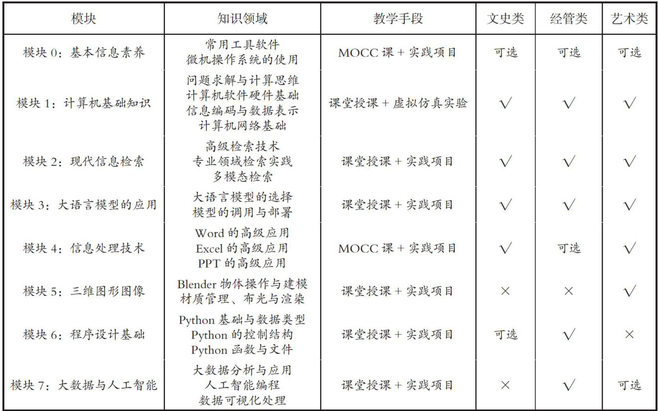 [摘要]面对国家高等教育发展的新方略,新文科需要进行知识结构转型。作为基础教学的信息技术教育也面临改革。为促进复合型的人才培养,并解决当前新文科计算机课程体系存在的问题,从专业需求、课程体系、教学内容、师资队伍等多方面开展教学研究和实践,提出了分层分类的计算机课程体系和模块化的知识架构,以培养学生的跨领域知识融通能力和实践能力为目标,将新一代信息技术深度融入基础教学,建设新文科背景下计算机课程体系。