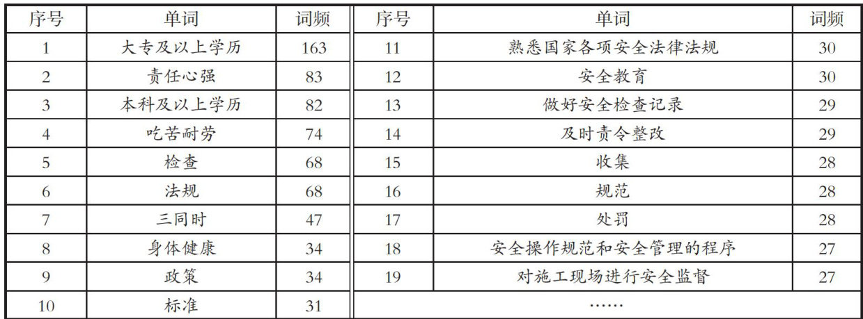 [摘要」为精准对接校企之间的供需关系,为“建筑施工安全”课程建设提供依据,利用爬虫软件对建筑行业安全管理岗位的招聘信息进行数据挖掘,并利用“微词云”平台绘制了相关的高频词云图,指出应将招聘职位要求中的部分高频词作为授课时的重点内容。最后,对课程设置提出了建筑施工过程与安全管理并重、融入国家法律和标准、注重实践能力的提高、适当借鉴注册安全工程师考试大纲、尽早开展职业规划的5个建议。