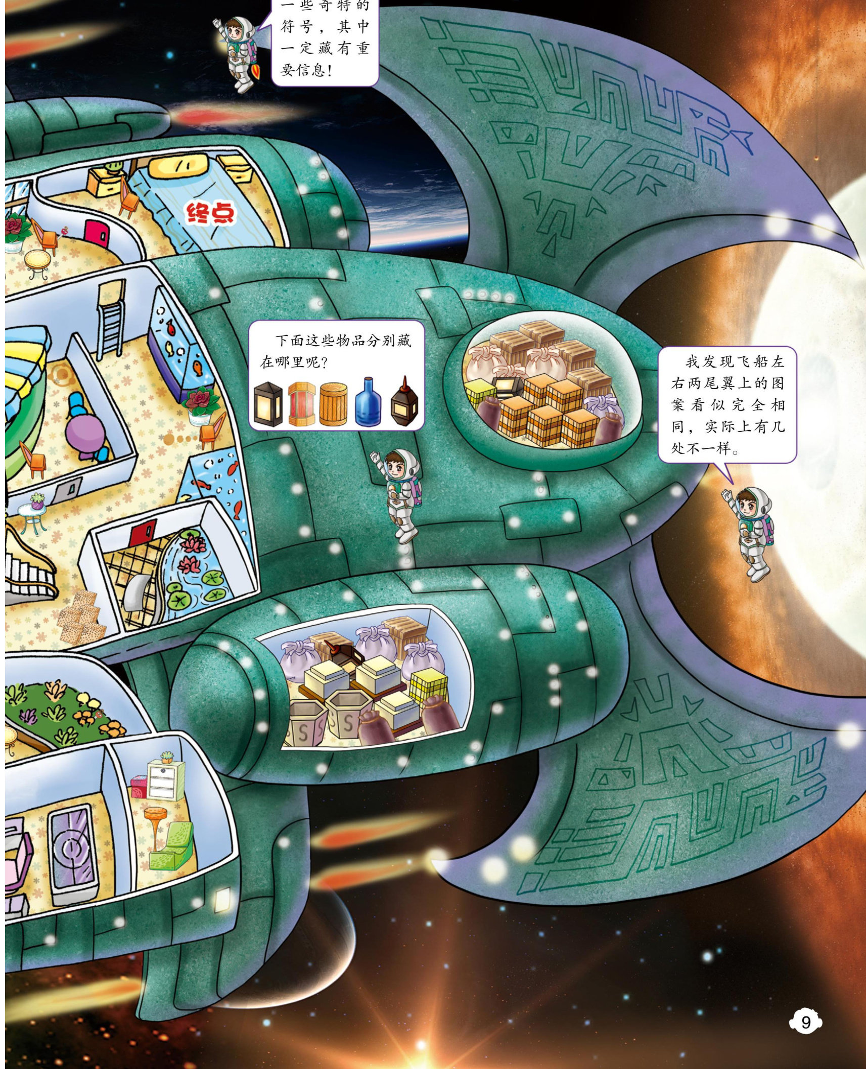 第8页无人飞船从起点到终点的路线见本页答案图1。找钥匙、奇特的符号、找物品、尾翼图案分别见本页答案图1中红色圆圈、蓝色圆圈、橙色圆圈、紫色圆圈标示处。 第10页马到成功迷宫路线见本页答案图2。成语接龙:龙马精神、神来之笔、笔走龙蛇、蛇珠雀环、环环相扣、扣人心弦、弦外之音、音容笑貌、貌合神离、离经叛道、道路以目、目不斜视、视若无睹、睹物思人、人各有志、志同道合、合二为一、一鼓作气、气象万干、千军万