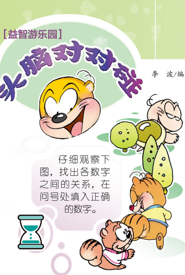 请将1-8这8个数字分别填入上面的空格内,使数字间形成循环的算式。 当铅笔和毛笔各自代表哪个数字时,上下两道等式可以成立? 桌上放着11张扑克。请仔细观察,找出这些扑克摆放的规律,在问号处放上符合摆放规律的扑克。 数字 123. 上面的等式左边的5个数字完全相同,5只蝴蝶飞过来正好把5个数字遮住了。你知道蝴蝶遮住的是哪个数字吗?