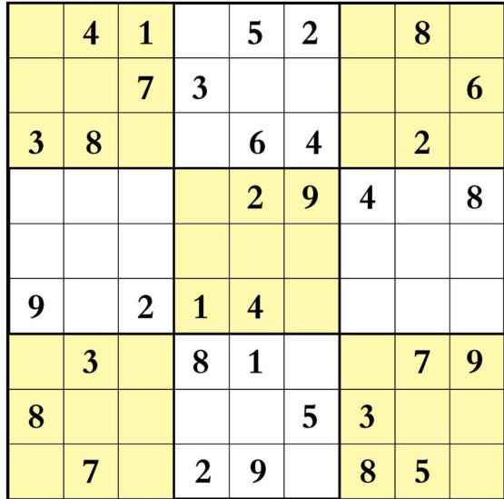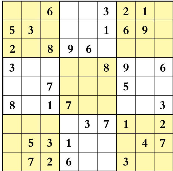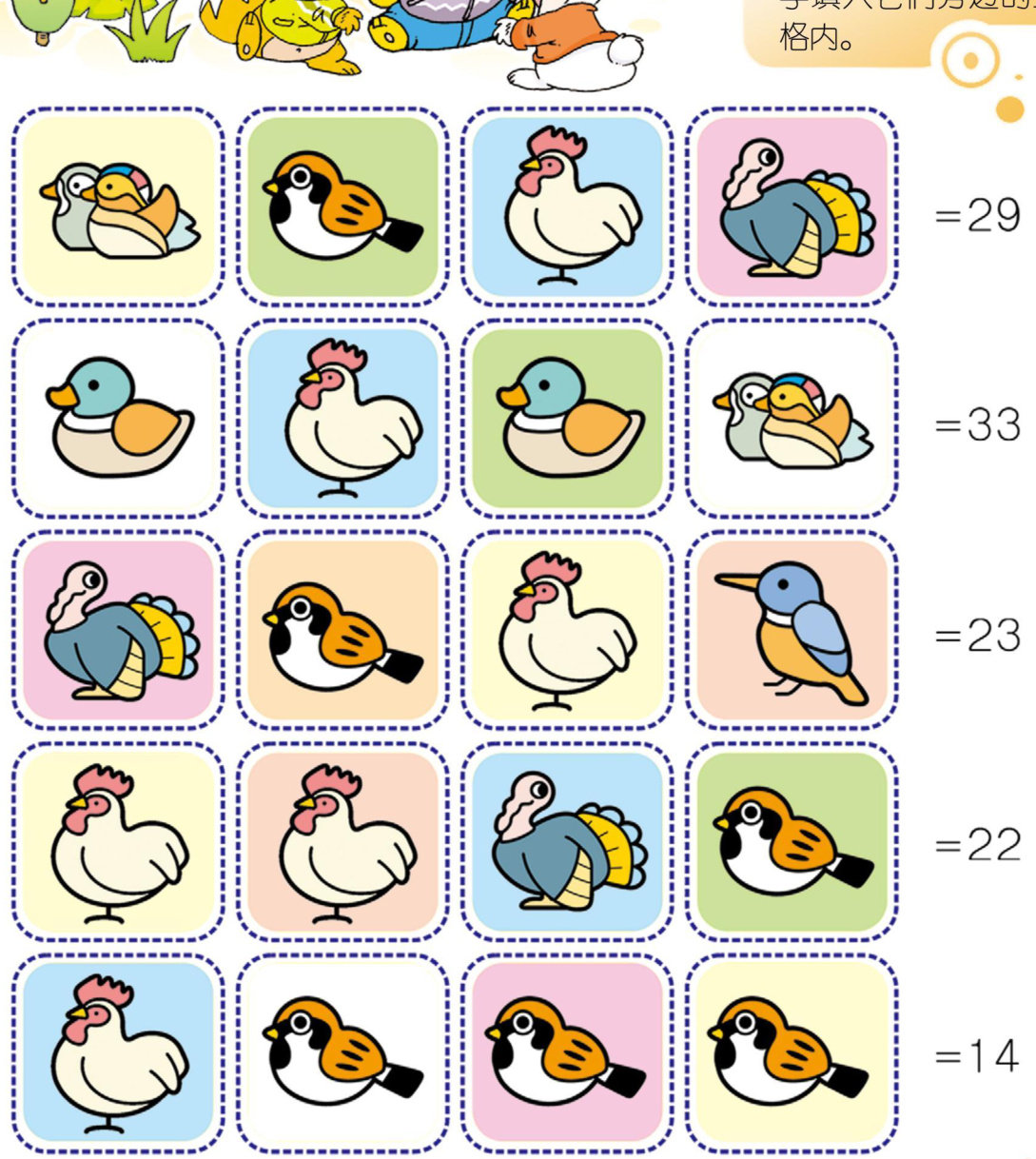 如果麻雀代表的是数字2的话,那么其他动物代表的分别是哪个数字呢?请分别将各动物代表的数字填入它们旁边的空 仔细观察上面的数列,找出其中的规律,在问号处填入正确的数字。 请在上面右边的圆圈中选出正确的数字填入左边的空格中,使左边每一行、每一列和对角线上的数字之和都等于23。 请将右图分为形状相同、大小相等的五个部分,使每部分中的三个数字之和都相等。