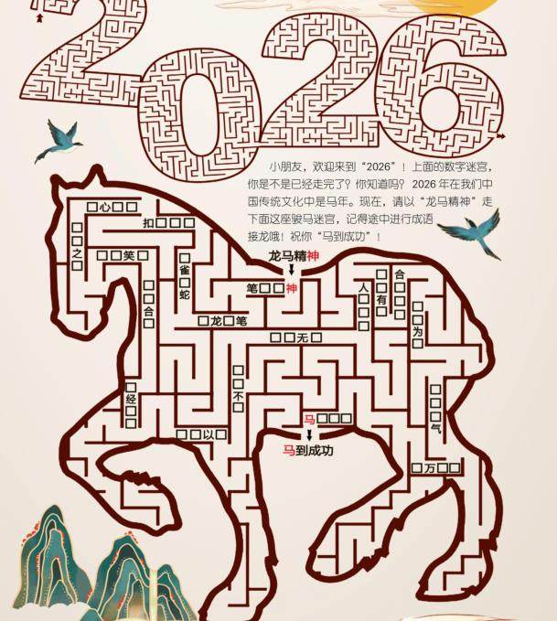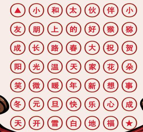 小猕猴给小朋友的新年祝福就藏在上面的汉字迷宫中哦!请从左上角的三角形开始一直走到右下角的五角星。只能按水平方向或垂直方向前进。快来试一试吧!走出迷宫,你就收到小猴的美好祝福啦!