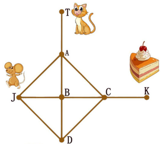 猫捉老鼠 猫捉老鼠的游戏开始啦!游戏规则是:每个字母代表一个地点,两点之间的连线代表路径,T是猫的起点,J是老鼠的起点,K是老鼠的目的地。猫和老鼠每次只能移动一步到邻近地点,双方轮流移动,轮到谁谁就必须移动;猫移动一次后,下一次不能再后退到原处,例如猫从A走到B,下一次不能从B走回到A,但可以从B到C,再从C到A。老鼠一旦吃到蛋糕就算老鼠贏,猫捉到老鼠就算猫贏。假定游戏双方智商都不低,不论谁先走