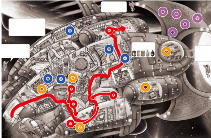 小航天员玟玟在太空中发现了一艘飘荡着的飞船。他进入飞船后看到里面生活设施齐全,但没有一个船员。 飞船每道门的门锁的颜色和打开它的钥匙的颜色相同,我要把这些钥匙都找到。 起点 进入这艘飞船后,怎么走才能到达船尾终点处呢? 船舱里有一些奇特的