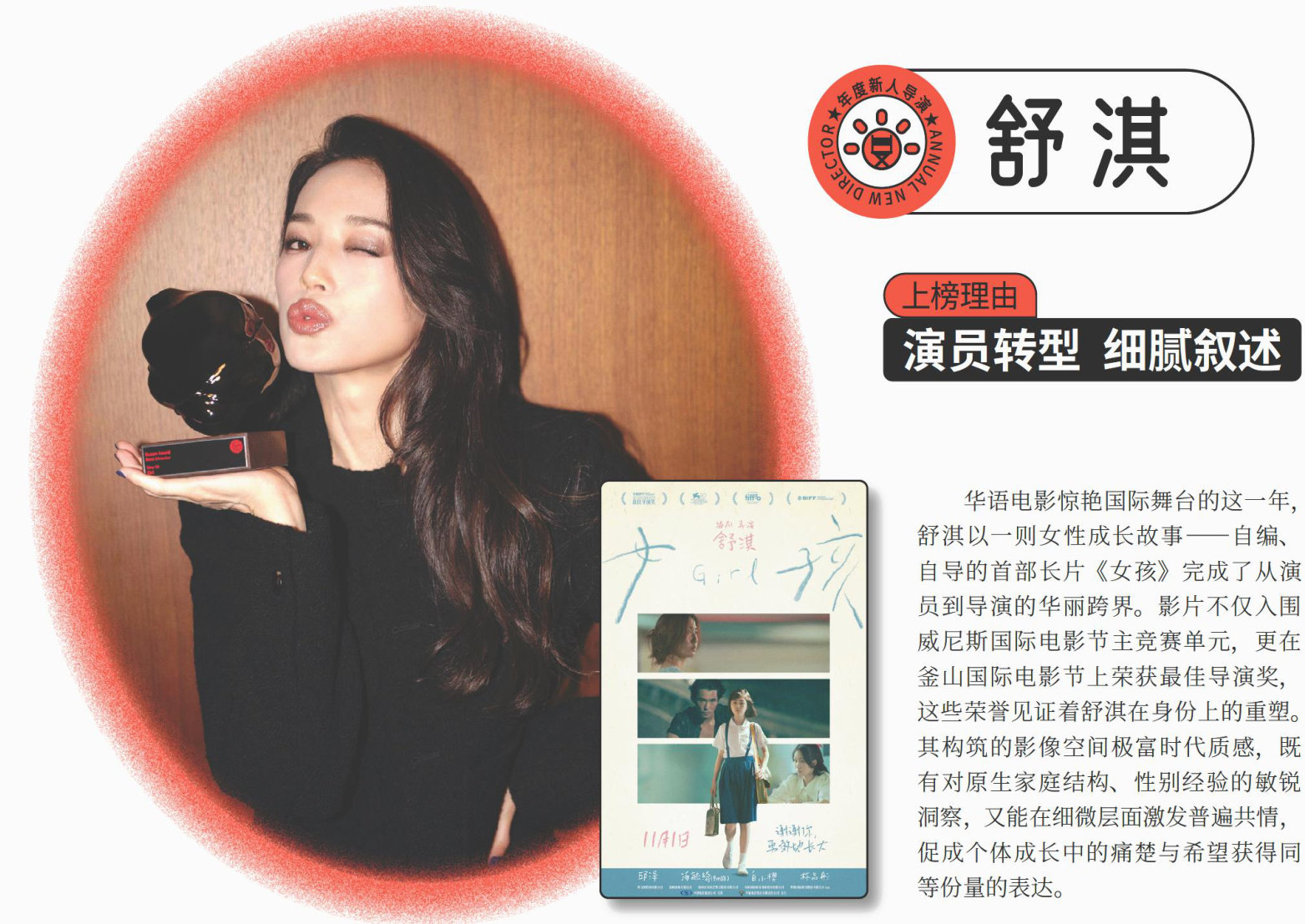 2025年,新人面孔、成熟表现为中国银幕注入勃勃生机。段奥娟、丁程鑫从偶像跨界,让观众看到偶像的实力;张伟丽、丁湘源从运动赛场奔赴银幕,带来别具一格的力量和美感;王安宇、张新成从小荧屏冲击大银幕,开启影视双管齐下模式;张文昕、白小樱、徐卓儿首次踏上大银幕,让观众耳目一新,眼前一亮。广阔银幕,大有可为;新人登台,未来可期。 (按出演影片上映时间逆序排列) 段奥娟 上榜理由 本色入镜 破壁生